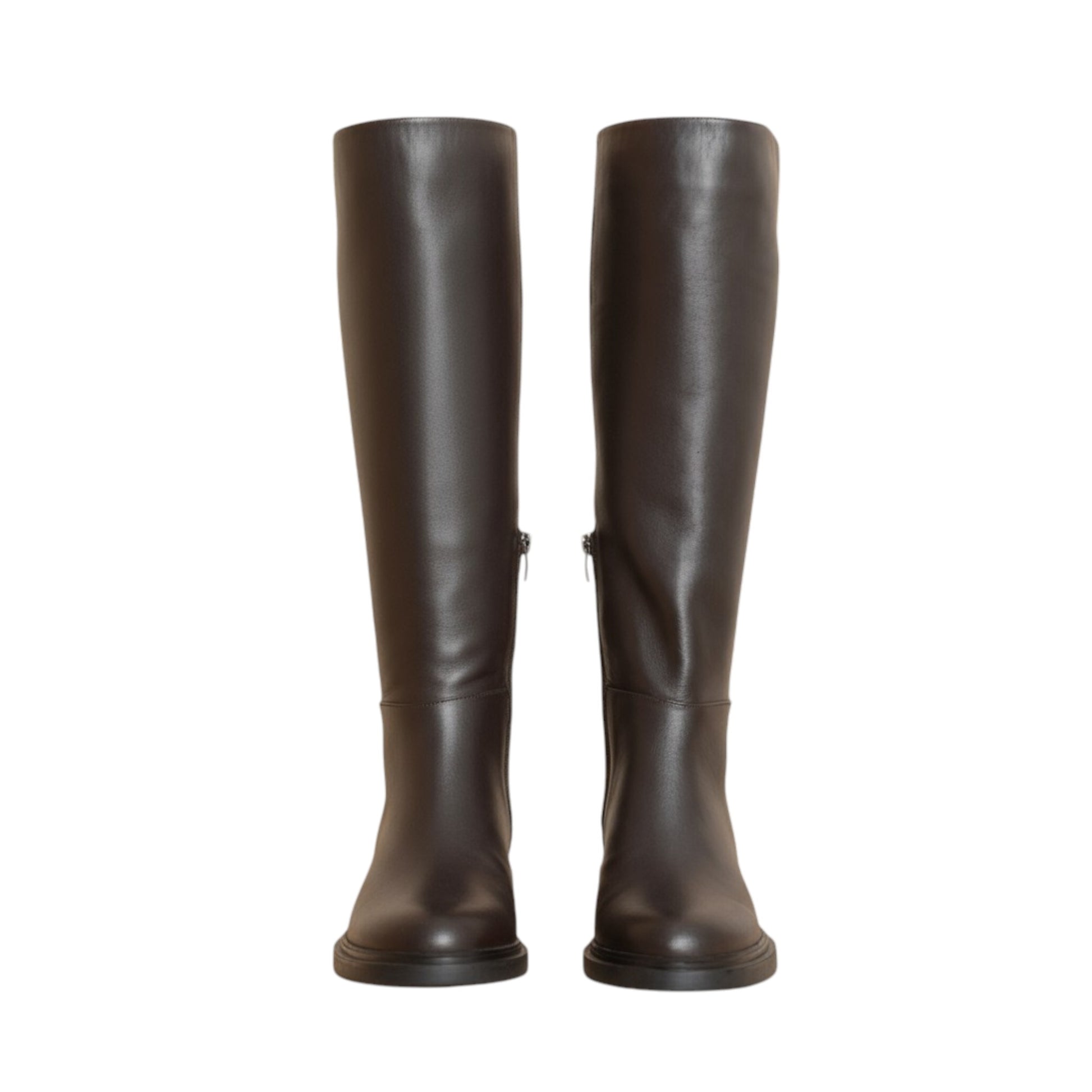 The Skadi Brown Knee-High Boot embodies classic craftsmanship with a modern minimalist edge. Made from 100% genuine leather, it features a smooth finish, structured shape, and a comfortable 3 cm (1.2 in) low heel — ideal for all-day wear.