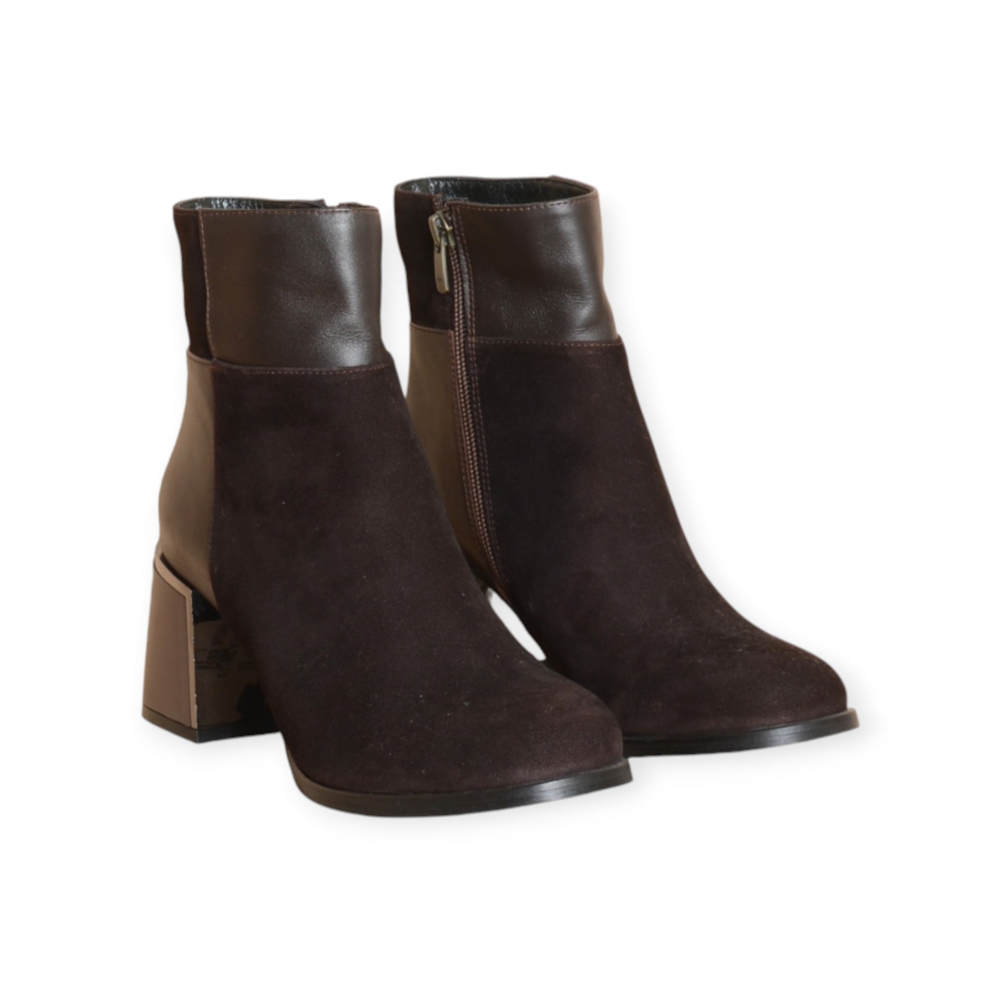The Thyra Brown Ankle Boot blends rich textures of smooth leather and soft suede for a sophisticated yet versatile look. Featuring a modern block heel with metallic detail, this design adds subtle edge and stability to your stride.